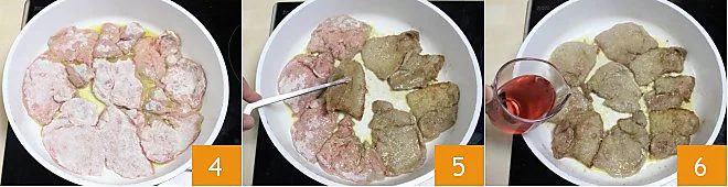 When the oil is hot, place the scaloppine in the pan and let them brown on both sides for a couple of minutes, until they are golden brown (4-5). Add the wine and let it evaporate 6.
