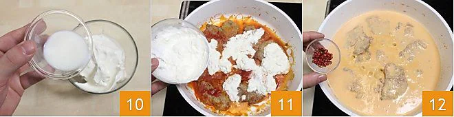 Then add the mascarpone which you have thinned with a bit of milk 10, pour the mascarpone into the pan and blend everything well 11, let it cook until the sauce thickens, then add the pink peppercorns 12. Serve the pink scaloppine covered with mascarpone sauce.