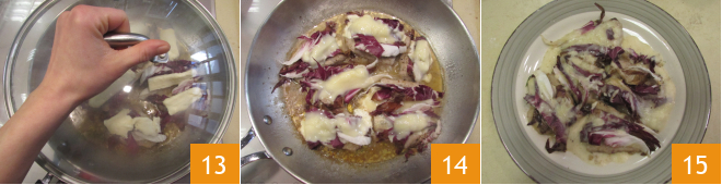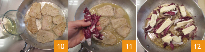 Deglaze with white wine 10 and let it evaporate, then add the radicchio strips on top of each scaloppina 11 and cover with the taleggio slices 12.