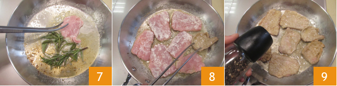 Place the meat in the pan 7 and brown for 3 minutes over medium-high heat, then turn the slices over using kitchen tongs 8. Salt and pepper 9.