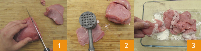 To prepare the scaloppine with taleggio and radicchio, first cut 8 slices from the veal loin 1, then pound them with a meat tenderizer 2. Transfer the slices into a container and coat them in flour to cover them evenly on both sides 3.