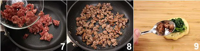 and cook it in a very hot non-stick pan 7, browning it well 8. Now assemble the snack by placing a teaspoon of spicy broccoli rabe and some sausage crumbs on each flatbread 9: here are your flatbreads with spicy broccoli rabe and sausage ready! If desired, you can decorate them with a piece of chili pepper!