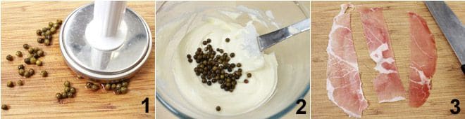 To assemble the flatbreads with culatello and squacquerone cream, start by preparing the squacquerone cream with green pepper: put the squacquerone, fresh cream, and two tablespoons of oil in a blender. Blend until all the ingredients are well combined into a smooth and homogeneous cream. Crush the green pepper 1 and add it to the squacquerone cream, then adjust with salt and mix well 2. Fill a piping bag with a serrated tip with the squacquerone cream with green pepper and cover the flatbreads. Cut the culatello in half 3 and place it on the flatbreads, finally finish by drizzling a few drops of Modena balsamic vinegar glaze on each snack.