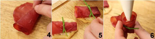 Meanwhile, prepare the rolls: roll up the slices of bresaola to form small cones 4, then tie the cones with chive strands 5. Take the piping bag with the cream and fill the rolls 6. Place one roll on each flatbread and serve.