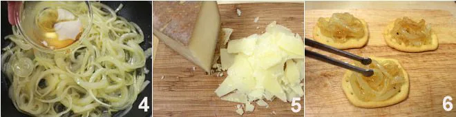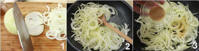 Start by preparing the caramelized onions: clean the onions and slice them 1 not too thinly (using a knife or a mandoline). Heat the oil in a non-stick pan and allow the sliced onions to soften 2. When the onions become translucent, add the brown sugar 3 and mix well.