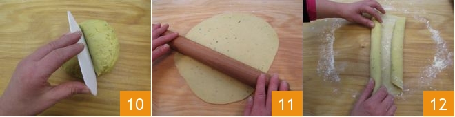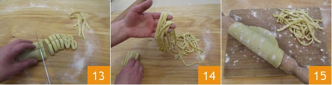 With a sharp blade, cut the dough into rings of about 1/2 an inch thick 13. Unroll them gently with your hands 14, they should be about 5-6 inches long. At this point, your scialatielli are ready to be cooked in plenty of boiling salted water for 4-5 minutes.