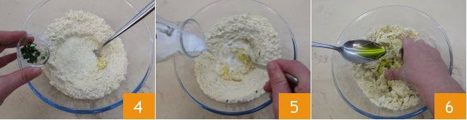 then the minced basil 4, and after adding the room temperature milk in a stream 5, begin kneading by hand, finally pouring in the extra virgin olive oil 6.