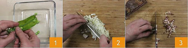 To prepare the savory scones with peas and bacon, start by cleaning the fresh peas: shell them by opening the pods and saving the peas in a bowl 1. Take half a yellow onion, peel it, place it on a cutting board, and chop it finely 2, then cut the fresh bacon into cubes 3, use whichever you prefer: sweet or smoked. If you don't want to use fresh bacon, you can also use diced bacon found in the refrigerated section at the supermarket.