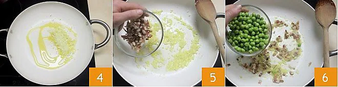Now take a non-stick pan, pour a drizzle of oil and fry the chopped onion 4. Once the onion is browned, add the diced bacon 5 and finally the shelled fresh peas 6. Let cook on low heat for about 15-20 minutes, adding water if needed to help the cooking. Once cooked, let them cool.