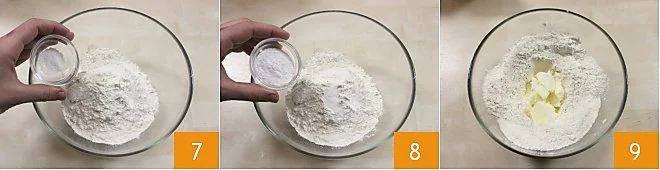 Meanwhile, prepare the scone dough: place the flour in a large bowl and add the salt 7, the yeast 8, and the butter cut into pieces at room temperature 9.