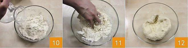 Mix the ingredients, add the milk 10, and knead with your hands 11 until you get a rather compact mixture 12.