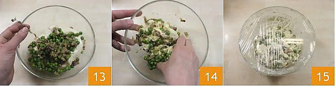 At this point add the cooked peas and diced bacon and a few thyme leaves 13. Continue to work by hand 14 until the dough is smooth. Cover the bowl with plastic wrap 15 and leave it to cool and rise in the fridge for at least half an hour.