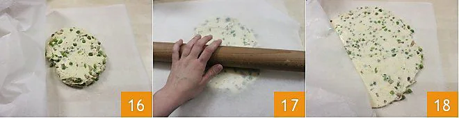 Spread a piece of parchment paper on a pastry board and place the dough on it once it has solidified and risen 16. Cover the dough with another piece of parchment paper and roll it out with a rolling pin 17 into a sheet about 0.6 inches thick 18.