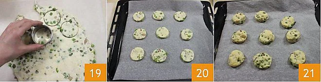 Then cut out circles from the rolled-out dough using a round cookie cutter with a diameter of 2.5 inches 19. Transfer the pastry circles onto a baking sheet lined with parchment paper 20 and bake in a preheated static oven at 392°F for 15 minutes (if using a convection oven, bake at 356°F for about 10 minutes). When the scones are lightly golden on top, they are cooked 21. Remove them from the oven and transfer them to a rack to cool.