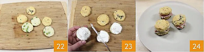 When they have cooled, place them on a cutting board or surface and cut them in half 22. Spread fresh cheese or mascarpone 23 and fill with cooked ham (or speck) sliced thinly. Now your savory scones with peas and bacon are ready to be served on a serving plate and enjoyed with their delicious filling 34!
