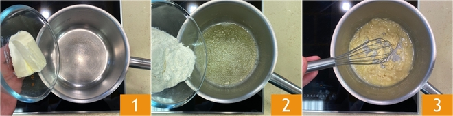 To prepare the sea and mountain lasagna, start by making the bechamel: place the butter in a saucepan 1 and melt it gently. Meanwhile, heat the milk in a separate pot. Once the butter is fully melted, add the flour all at once 2 and stir with a whisk until you get a smooth, lump-free mixture 3.
