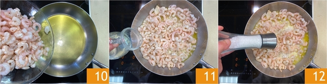 Add the shrimp 10 and sauté over high heat for 3-4 minutes. Deglaze with white wine 11, let it evaporate, then season with salt 12 and pepper.