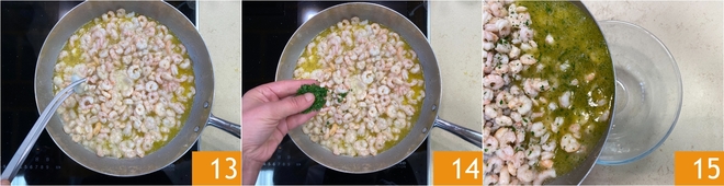 Remove the garlic 13 and add a handful of chopped parsley 14, then transfer the shrimp and cooking juices to a bowl and set aside 15.