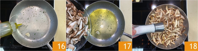 In the same pan, add the remaining half of the oil with a new clove of garlic 16, then add the mushrooms 17. Sauté over high heat for 5-6 minutes and season with salt 18.