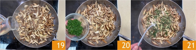 Deglaze with white wine 19. Once the liquid has evaporated, finish with the chopped parsley 20 and remove the garlic 21.