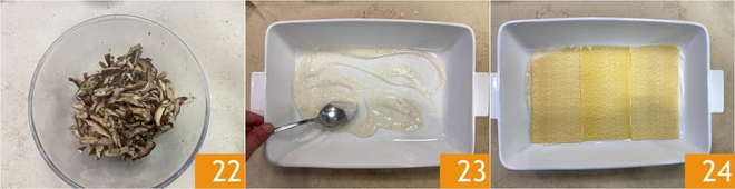 Transfer the mushrooms to a bowl and let them cool slightly 22. Now you can assemble the lasagna: spread some bechamel on the bottom of a baking dish 23, then place the first layer of pasta sheets 34.