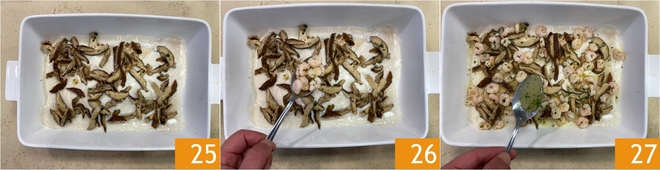Cover with a thin layer of bechamel and some of the mushrooms 25. Add a portion of shrimp on top 26, and a few tablespoons of their juices for flavor 27.