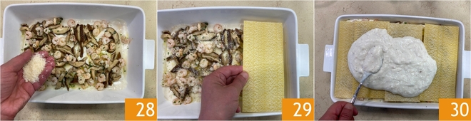 Sprinkle with grated cheese 28. Cover with another layer of pasta 29, spread more bechamel 30. Continue in this manner, alternating mushrooms, shrimp, and cheese until all ingredients are used up.