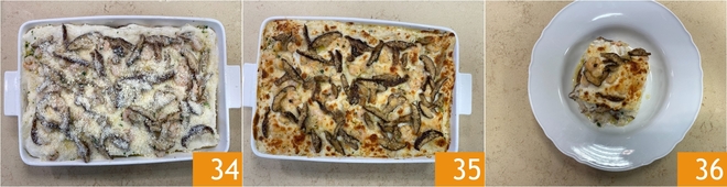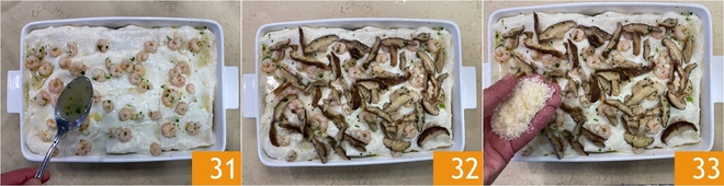 For the last layer, finish with pasta covered in bechamel and top the surface with the shrimp and their cooking juices 31, the mushrooms 32, and then a final generous sprinkle of cheese 33.