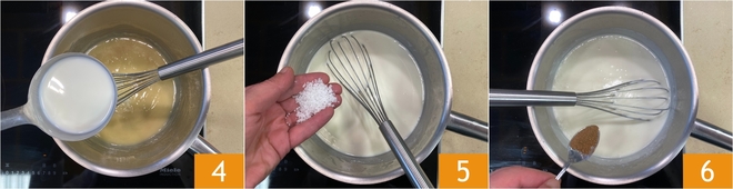 Slowly pour in the hot milk 4, continuing to whisk until the sauce begins to thicken; at this point, season with salt 5 and a pinch of nutmeg for fragrance 6.