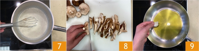 Cook for a few more moments until the bechamel is smooth and velvety 7, then turn off the heat and set aside. How to Clean Porcini Mushrooms and slice them evenly 8. In a large pan, heat half of the oil with a clove of garlic 9.