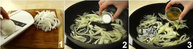 To prepare the sea bass with bacon, onions, and sweet and sour oranges, start by cutting the onions into slices that are not too thin 1 and let them soften with the 3 tablespoons of oil. Add the three teaspoons of sugar 2 and as soon as it starts to caramelize, add the vinegar 3, salt, and pepper.
