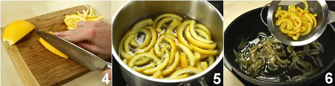Meanwhile, cut the zest of an orange into strips 4, trying to avoid removing the white part as much as possible; blanch them for a few minutes in a small pot with a little water 5, remove them from the water, and add them to the onion mixture 6, continuing to cook for another 5 minutes.
