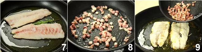 Clean the sea bass and fillet it into two fillets How to clean the sea bream, or for convenience have your fishmonger fillet it for you. Quickly sauté it with two tablespoons of oil and a sprig of rosemary, turning the sea bass carefully to avoid breaking it. In a separate pan, brown the bacon cubes, which should become crispy, then add pepper and combine it with the sea bass.
