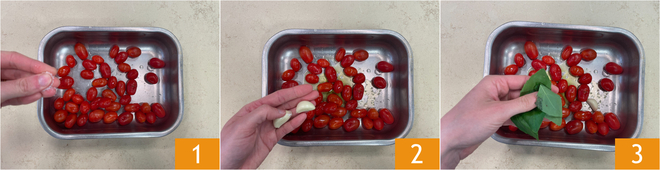 To prepare the sea bass fillet with cherry tomatoes, start with the sauce: place the whole cherry tomatoes in a baking dish, then season with salt 1, garlic cloves 2, oil, and a few basil leaves 3.