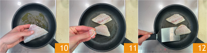 In a well-heated non-stick pan, heat a drizzle of oil first, then place the sea bass fillets with the skin side down 10. Gently press the fillets with a spatula to prevent them from curling during cooking and cook for about 5 minutes; when they start to turn white, salt them 11 and flip to the other side 12.