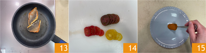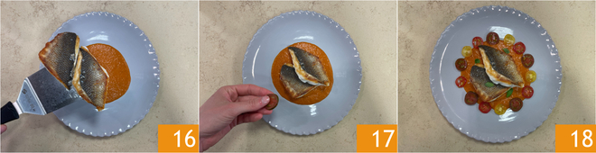 Continue cooking for another minute 13. When the fillets are golden, cut the colorful datterini tomatoes into thin rounds 14. You are ready to plate: spread the datterini sauce at the base of the serving dish 15.