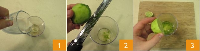 To prepare the seafood cone with mojito mayo, start by making the latter. In the bowl of a mixer, pour the oil, soy milk 1, salt, then grate the lime zest 2 and squeeze the juice of half of it 3.