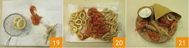 and then drain them as soon as they start to brown 19. Drain on absorbent paper and proceed until you finish the ingredients 20. Arrange in paper cones and the mock mayonnaise in small bowls: the seafood cone with mojito mayo is ready, serve very hot 21!