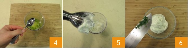Add the rum 4 and create a thick cream using an immersion blender 5. Transfer it into a bowl, add the mint that you have finely chopped with a knife 6.