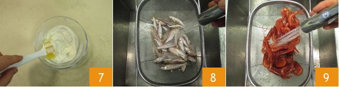 Mix and set aside in the refrigerator 7. Meanwhile, rinse the seafood well, preferably individually, including mullets 8, shrimps 9,