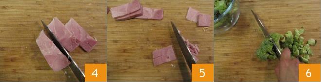 With a knife, slice the cooked ham into half-inch thick slices 4. From these, cut small cubes 5. Finally, coarsely chop the broccoli florets 6 and proceed to cooking.