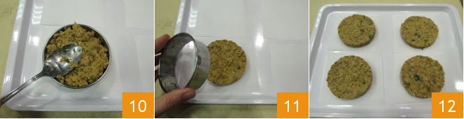 Place them on a tray and lay an 8 cm (about 3-inch) diameter pastry ring on one of them. Fill it with the prepared mixture, pressing it down with a spoon 10. Then gently remove the pastry ring 11 and repeat the same operation for the others 12. Cover with plastic wrap and place in the refrigerator to firm up.