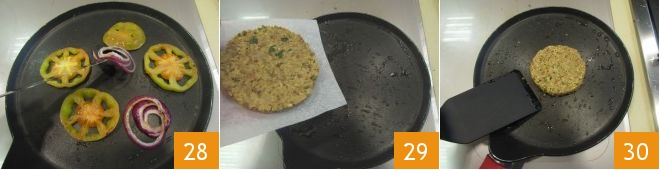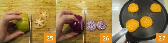 and do the same for the tomatoes and onions 28. Take the burger 29 and place it on the same pan where you cooked the vegetables. Wait about 3 minutes, then flip it 30