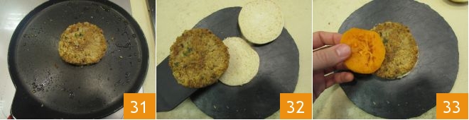and cook it for a couple more minutes on the other side 31. Place it inside the bun 32, add the sweet potatoes 33,