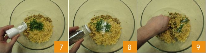 and blend them until a puree is obtained 4. Then add it to the seitan mixture 5 in a large bowl. Wash and chop the coriander 6