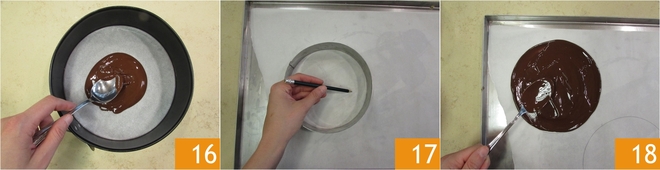 Meanwhile, line an 8-inch springform pan with parchment paper on the base and a strip of acetate on the sides. Pour 4 tablespoons of chocolate inside and spread it over the entire base with the back of a spoon 16. Put it in the fridge. Now prepare the other discs; you will need a total of 5. Draw 5 circles of 7 inches on parchment paper with a pencil, using a pastry ring as a guide 17. Flip the parchment paper onto a baking tray and pour 2 tablespoons of chocolate for each circle. Spread the chocolate using the back of a spoon 18.