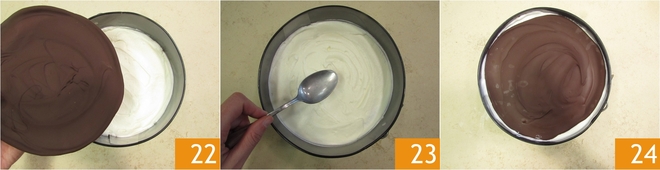Once you have obtained 5 chocolate discs, transfer them to the fridge and wait for them to set well 19. When the chocolate has solidified, take the pan again 20 and transfer a layer of cream inside 21.
