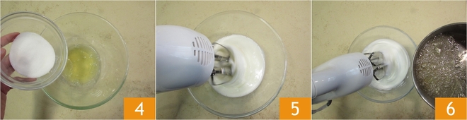 When it reaches 239°F, you can start whipping the egg whites. Pour them into a bowl, add the remaining sugar 4, and whip them with electric beaters 5 until they are very stiff. When the syrup reaches 250°F, pour it slowly into the egg whites, still beating 6.
