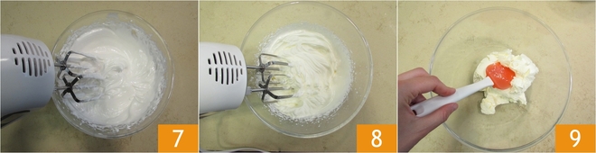 Continue whipping with the beaters until the mixture cools down. Now clean the beaters and whip the cream; it should be semi-whipped 8. Soften the mascarpone in a large bowl by working it with a spatula 9.