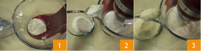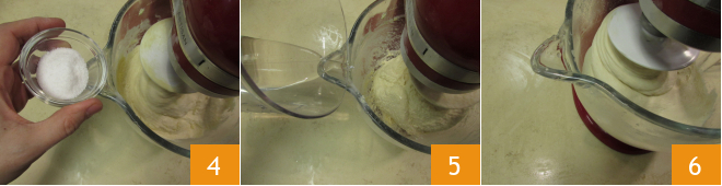 Gradually add the remaining water and when it's almost used up, add the salt 4. Add the remaining water 5 and let the mixer work again 6. In total, it should run for 10 minutes on first speed and another 5 minutes on second speed.